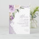 Uma fonte manuscrita, com assinatura combinada com quadros geométricos, fundos cintilantes e florais exuberantes são usados nesta coleção para definir um tom quente e íntimo para o seu casamento. O menu de casamento mostrado aqui, com seu arranjo floral de canto em mauve, lavanda e creme, é um fundo elegante para adicionar suas próprias seleções de menus, nomes e data de casamento. Procure ID889 para ver todos os produtos neste conjunto de casamento.