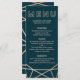 Um menu de casamento no inverno apresenta um padrão geométrico de "folha falsa" rosa de ouro sobre um fundo de turquesa escuro. Todos os seus detalhes estão soletrados num belo magnífico erro tipográfico moderno. Eu ofereço um serviço de personalização gratuito, se você tiver algum pedido especial, por favor me envie um e-mail para: margherita@bluebirdinvites.com Clicando no botão personalizar, você pode acessar as ferramentas de edição e mudar a cor de fundo, digitar e muito mais Nota ___________________________________________________________________________________________________________________ A cor de cobre metálica não é folha de papel real, é apenas um efeito de cor Este é um menu IMPRESSO FLAT, se você precisar de uma versão dobrada, entre em contato com, Eu criarei um produto personalizado para você. _______________________________________________________________________________________________________________________________________________________________________