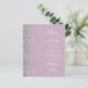A borda esquerda deste elegante menu de casamento moderno apresenta uma borda cintilante de prata. O texto personalizável combina o script branco de escrita manual e as fontes em um fundo lilático empoeirado. O verso apresenta um lilás empoeirado e design prateado correspondentes.
