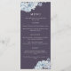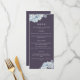 Um elegante cardápio de casamento com flores azuis empoeiradas de hidrangea em um fundo azul marinho, personalizado com seus nomes e data de casamento. Os detalhes do menu estão em branco.