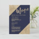 Elegantes, sofisticados e glamourosos cantos impressos em falso glitter dourado e escrita dourada em um fundo azul-marinho, cartões de menu de recepção de casamento. Este design clássico e sofisticado é perfeito para a recepção de casamento elegante, sofisticada e moderna. Personalize com o seu próprio menu na frente, juntamente com seus nomes e datas. Em seguida, personalize a parte de trás com a inicial do seu monograma. Todo o design de impressão de foto.