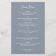 Menu moderno de casamento azul empoeirado com um simples design com o cabeçalho em uma tipografia de script elegante e seu menu em uma fonte minimalista sans serif. Este cardápio chic do casamento funciona bem com qualquer estilo de casamento.