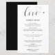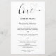 Um belo cardápio de casamento com uma design simples e mínima com a palavra "amor" em uma tipografia elegante com coração no final. Abaixo está seu menu em um sans serif moderno junto com seus nomes e data. Esses menus baratos de casamento com estilo minimalista são impressos em folhas de papel para uma opção econômica.