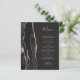 A borda esquerda deste elegante convite de casamento moderno apresenta uma coloração aquosa preta, borda agitada, aparada com falso rosa dourado. O texto personalizável combina o script de escrita manual rosa-rosa e as fontes de impressão em um plano de fundo off-black. O verso apresenta um design de agate preto e rosa dourado correspondente.