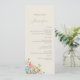 Comemore seu casamento de primavera ou verão com este elegante menu de casamento de flor silvestre com nomes personalizados no topo. Um fundo de creme macio define a palco para a caligrafia romântica e fontes serif modernas, enquanto um vibrante buquê floral de flores silvestres cor-de-rosa, amarela e azul adiciona um novo toque sazonal à base. Perfeito para casamentos de jardim, recepções ao ar livre ou comemorações ao estilo country. Edite facilmente os detalhes do menu e o nome do convidado para corresponder ao seu evento.