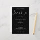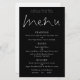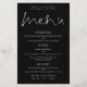 Menu de Casamento Preto Branco com Script Na moda de Orçamento. Um tamanho de preço orçamentário de 5,5" x 8,5", um design tipográfico elegante em preto clássico com tipografia branca e um script de na moda para o Menu do cabeçalho. Personalize facilmente o resto do texto para seus próprios detalhes, o que inclui espaço para suas opções vegetarianas ou vegetarianas. Você também pode alterar estilos e cores de texto, bem como as cores de fundo, por meio da opção personalizar mais, se desejar.