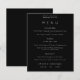 Menu de Casamento Preto Branco de Texto Simples. Um alternativo de 4,5 pol x 5,6 pol com preço inferior. Disponível em um STOCK DE CARTÃO SEMI GLOSS 110 lb, que é a opção padrão (recomendada para convites, semelhante à espessura de um cartão postal) OU um STOCK DE PAPEL THINNER FINISH DE 80 lb FINISH (ideal para gabinetes). Você também pode alterar o estilo e as cores da fonte e as cores de fundo na frente e na parte traseira, se desejar, por meio da opção Clique para Personalizar mais.