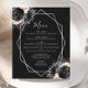Este elegante menu de casamento moderno apresenta uma moldura geométrica prateada decorada com buquês florais de pêssego, preto e prateado sobre fundo preto. O texto personalizável combina a escrita manual imétrica de cinzas prateadas, a placa de cobre e as fontes itálicas. O reverso é preto sólido.