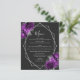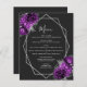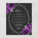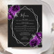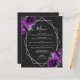 Este elegante menu de casamento moderno apresenta uma moldura geométrica prateada decorada com buquês florais roxas de ameixa e prata em fundo preto. O texto personalizável combina a escrita manual imétrica de cinzas prateadas, a placa de cobre e as fontes itálicas. O reverso é preto sólido.