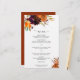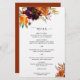 Um cardápio de casamento floral russo com uma cor d'água pintada de buquê floral com tons quentes e úmidos de laranja queimada, terracota e burgundy profunda junto com um pouco de verde. Este menu elegante com os tons ricos do outono é excelente para um casamento outono.