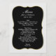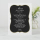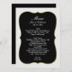 Cartão de menu de recepção de casamento chic feito em um papel d'água branco com aparência de fundo, com uma área de texto decorativo preto embebida em ouro. O texto personalizado, em branco, está pronto para personalizar a sua recepção de casamento.