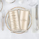 Este belo cardápio de champanhe é perfeito para o seu elegante decoro de casamento. A base metálica falsa é enquadrada em cima e em baixo com damasco, e o título está na tipografia moderna da escrita. Na parte de trás está um monograma elegante.
