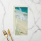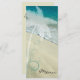 Personalize o Menu de Casamento de Praia Tropical com os detalhes da refeição que você servirá na sua festa de destino, chá de panela ou casamento da ilha adicionando a salada ou o primeiro curso, a entrada ou o segundo curso e a sobremesa ou o terceiro curso. Este tema trópico, menu personalizado de casamento, apresenta uma fotografia cênica do verde-turquesa ou do oceano azul-aqua com a praia de areia e uma palmeira branca e design de espiral teal adornando a esquina.