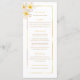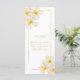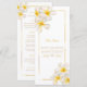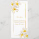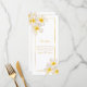 Flores frangipani simples plumeria tropical de arte botânica num menu de quadro de efeito de ouro. Personalize com seu próprio menu de quatro cursos de casamento. Outros itens correspondentes estão disponíveis. Pintura a aquarela original e design por artista e designer Sarah Trett exclusivamente para www.mylittleedenweddings.com