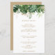 Menu de casamento botânico moderno com uma borda superior composta por verde tropical pintado com aquarela e folhas de ouro falsas. Esses menus baratos de casamento com um tema tropical elegante são impressos em folhas de papel para uma opção amigável ao orçamento e são perfeitos para um casamento de destino de verão.
