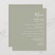 Este menu de casamento simples e moderno contém um texto branco sobre um fundo verde sábio. A palavra "Menu" aparece na caligrafia na moda. Adicione o nome do casal e a data do casamento em script e itálico, juntamente com os detalhes do menu na fonte sans serif. O reverso é uma sombra correspondente de verde de sábio sólido.