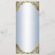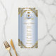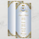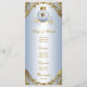 Menu de chá de bebê do príncipe com um lindo príncipe bebê afro-americano e carruagem em um elegante fundo azul bebê e dourado. Esses menus de chá de bebê do príncipe são facilmente personalizados para o seu evento, basta adicionar seus detalhes no estilo de fonte e layout que preferir.