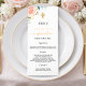 Cartão de menu de confirmação. Personalize e adicione um nome, data e menu. Um fundo branco chic. Decorados com ouro rosa e rosa-rosa-rosa-pincelada e folhas verdes de eucalipto, galhos, verde, folhas de ouro-farelo. Uma cruz de ouro falsa.
