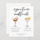 Este menu de coquetéis assinatura sofisticados apresenta tipografia preta personalizada acima de 2 drinks e seus ingredientes para o seu bar de casamento. Um desenho fofo de Sangria e Mojito de verão adiciona um charme legal ao menu do seu bar. Completo com os nomes do casal e data da recepção.
