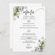 Este menu de evento de casamento apresenta um toque elegante com um roteiro caligráfico moderno e belo com texto regular acompanhado de um arranjo de folhas de folhagem de eucalipto com aquarelas. Vestir com sua própria imagem no fundo e uau seu convidado. Você pode personalizar o nome do casal, a data e o local Você só pode mudar a cor dos termos elegantes da caligrafia de "menu", "starter", "entrée" e "sobremesa". Você pode personalizar o menu como quiser.
