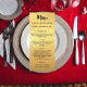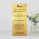 Cartão de menu de jantar de Natal. Personalize e adicione um nome/evento, data e o menu. Fundo com aparência dourada falsa, texto preto.