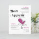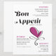 Estas folhas de papel de janto de casamento de 8,5" x 11", estilo de safra, menus a letras pretas com um título estilizado, "Bon Appetit", em letras grandes, com um sotaque cardíaco magenta num fundo de alabastro. O menu tem espaços reservados para 2 aperitivos, 2 entradas e 2 sobremesas e os nomes dos casais de casamento.
