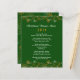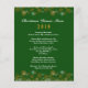 Modelo do menu de janto natalino impresso em papel de barato. Borda superior e inferior de flocos de neve dourados sobre fundo verde escuro. O título pode incluir o nome da família, com o ano para fazer uma festa divertida.