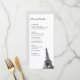 Menu de recepção de casamento preto e branco da Torre Eiffel moderna com a opção de personalizar totalmente todos os títulos e texto. Digite o editor do Zazzle para personalizações adicionais do design.