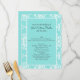 Grande menu de mesa de casamento feito em azul na moda aqua, com um quadro azul aqua e branco de damasco. O dorso é azul aqua sólido, com um bonito coração branco e um monograma do casal. Personalize todo o texto para atender às suas necessidades de recepção de casamento. Chic adicionado às suas mesas de recepção.