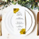 Personalize o bonito Menu Quinceañera de Girassol Amarelo com os detalhes da refeição que você servirá no seu doce janto de quinze aniversários ou almoço adicionando a salada ou primeiro curso, entrada ou segundo curso e sobremesa ou terceiro curso. Personalize-o com o nome da aniversariante de 15 anos e da festa de dois dias. Este elegante cardápio personalizado apresenta girassóis amarelos adornando os cantos com fundo branco.