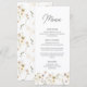 Este cardápio romântico de casamento apresenta uma letra de guião e flores silvestres delicadas. As costas apresentam um padrão de flores silvestres. Veja outros itens na coleção "Watercolor Wildflower".