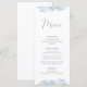 Elegante, cardápio boho apresenta folhas de eucalipto azuis empoeiradas. Personalize com o menu do seu evento com a modelo fácil de editar, apresentando uma fonte de script romântica e uma fonte de sans serif moderna. Verifique os itens correspondentes na coleção "Blue Eucalyptus".