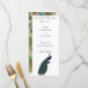 Este menu elegante é perfeito para qualquer janto de sentar. Apresenta um pavão no fundo da frente e uma fotografia de penas pavão coloridas no fundo. Todo o texto é personalizável para atender às suas necessidades de menu.