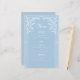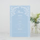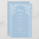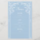 Este cardápio de casamento exumenta elegância e sofisticação. O fundo azul macio fornece uma canvas serena fresca que complementa perfeitamente os intrincados padrões florais brancos ao redor das bordas. O menu é escrito em uma fonte moderna e ousada, enfatizando a importância do evento. O resto do texto está numa escrita clássica, graciosa, criando um contraste harmonioso. No geral, esta design combina lindamente a tipografia moderna com elegância eterno, fazer ideal para qualquer celebração romântica de casamento. F004