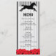 Rosas vermelhas e uma silhueta de cavalo de corrida em fundo de faixa branca e preta, estes cartões de menu são perfeitos para a sua festa Derby. Itens CORRESPONDENTES disponíveis na nossa coleção.