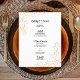 Personalize o Maple Leaf Edge Menu natural com os detalhes da refeição que servirá no seu almoço de chá de panela de setembro, outubro ou novembro, poste o brunch de casamento ou a recepção de casamentos, adicionando a salada ou o primeiro curso, a entrada ou o segundo curso e a sobremesa ou o terceiro curso. Personalize-o com os nomes da noiva e do noivo, localização do local e data do evento. Este cardápio de casamento de outono marrom mostra folhas de tom castanho adorando os cantos com fundo branco.