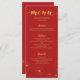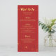 Cartão de menu de jantar de casamento com design de flores de cerejeira vermelhas e douradas.