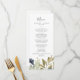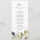 Este cartão verde de janto de casamento no outono é perfeito para um casamento outono. A design moderna rústica apresenta folhas azuis marinhos, verdes-sábios e douradas com espirros de flores azuis escuras. Este menu pode ser usado para recepção de casamento, janto de ensaio ou qualquer evento.