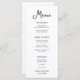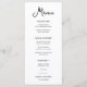 Estes cartões de cardápio de casamento simples e na moda, preto e branco apresentam tipografia de scripts caprichosos, estilo vintage. Adicione suas opções de janto para iniciantes ou aperitivos, primeiro curso, prato principal ou entrada e sobremesas. Um olhar elegante e clássico minimalista que ainda é único e contemporâneo e é perfeito para a sua recepção de casamento ou janto de ensaio, ou para as ofertas de comidas de chás de panela ou casais.