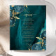 Este elegante menu de casamento apresenta buquês florais azuis de cor azul saltados com verde folha de cor dourada em dois cantos, em uma imagem de fundo do agate de cor d'água. O texto personalizável combina fontes de serifa e escrita manual de cor dourada. O verso apresenta um chalé e um design de ouro e floral e agate.