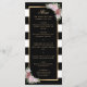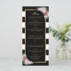 Um menu de casamento floral branco e preto elegante com riscas brancas, com rosas cor-de-rosa pinceladas. Itens correspondentes disponíveis.