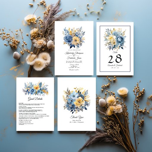 Um menu de casamento floral azul e dourado com uma tipografia elegante personalizável para as suas características específicas.
