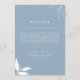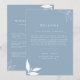 Abrace seus convidados com calor e estilo com o "Cartão de Boas-Vindas e Cronologia de Folhas de Galhos Minimalista Moderno em Azul Poeira" da Visual Studio no Zazzle! Este cartão sofisticado apresenta uma tela azul poeira calmante adornada com folhas de galhos brancas minimalistas, estabelecendo o tom para uma celebração memorável.