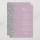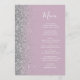 A borda esquerda deste elegante cardápio moderno de casamento apresenta uma falsa borda cintilante prateada. O texto personalizável combina o script branco de escrita manual branca e fontes de impressão em um fundo lilático empoeirado. O verso apresenta um design lilás e prateado.