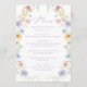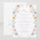 Complete your wedding reception details with this elegant floral wedding menu, designed to coordinate with the Elegant Pastel Wildflower Garden collection. This version features a soft watercolor floral wreath in delicate shades of pink, blue, yellow, and lavender, creating a romantic garden-inspired look that beautifully surrounds your menu selections. Paired with refined lavender lettering and a graceful script header, the layout keeps your starters, entrées, and desserts clear and easy to read while maintaining a polished presentation. The back of the menu showcases a coordinating wildflower bouquet for a cohesive and thoughtfully finished design. Perfect for spring and summer weddings, this personalized menu adds a charming and elevated touch to your tablescape while tying seamlessly into your wedding stationery suite.