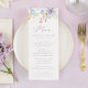 Complete your wedding reception details with this elegant floral wedding menu, designed to coordinate with the Elegant Pastel Wildflower Garden collection. The design features a delicate arrangement of watercolor wildflowers along the top in soft shades of pink, blue, yellow, and lavender, paired with refined lavender lettering and a graceful script for a romantic and timeless look. The layout allows your meal selections to be displayed clearly, including starters, entrées, and desserts, while maintaining a polished and cohesive presentation. The back of the menu features a coordinating wildflower bouquet, creating a beautifully finished design from every angle. Perfect for spring and summer weddings, this personalized menu adds a polished touch to your tablescape while tying seamlessly into your wedding stationery suite.