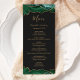 Este elegante e moderno menu de casamento mostra as bordas de cima e de baixo da esmeralda verde aquarela agata aparada com brilho dourado. O texto aparece em letras elegantes douradas, letras itálicas e em placas em fundo preto ardente. O design de ágata é repetido no reverso.
