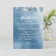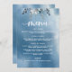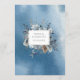 Cartão de menu elegante com azul decorativo, sábado e folhagem de cinza no topo. Lava-aquarela azul empoeirada como fundo. Menu em tipografia de Script escrita à mão. Volte ao buquê azul de lavagem de cor d'água e requintado no centro para o(s) seu(s) nome(s) e evento(s) ou data. parte do nosso casamento e da coleção de eventos "Blue Rustic Mounains".
