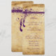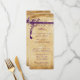 Menu de Casamento Vintage Medieval Renascença Rústico com Elementos Roxos em um design de papel desgastado. celeiro rústico de fazenda no quintal, roxo e bege marrom caramelado