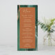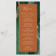 Este elegante cardápio moderno de casamento apresenta uma cor verde esmeralda de água. O texto personalizável combina um script de manuscrito branco de cor dourada com fontes itálicas e em prato em um fundo laranja ou ferrugem queimado. O verso apresenta um design emerald verde e dourado.